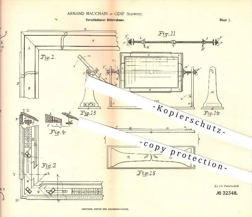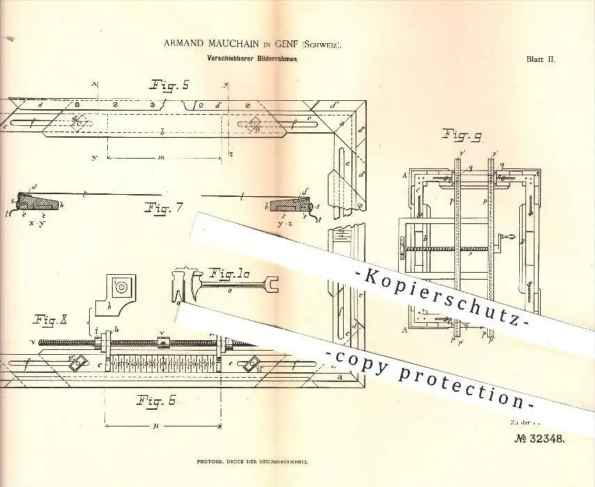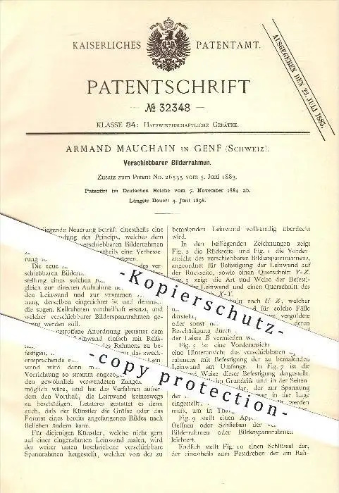 original Patent - Armand Mauchain in Genf , Schweiz , 1884 , Verschiebbarer Bilderrahmen , Bild , Bilder , Rahmen , Foto
