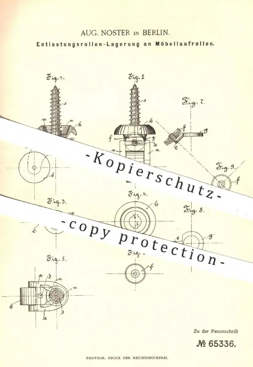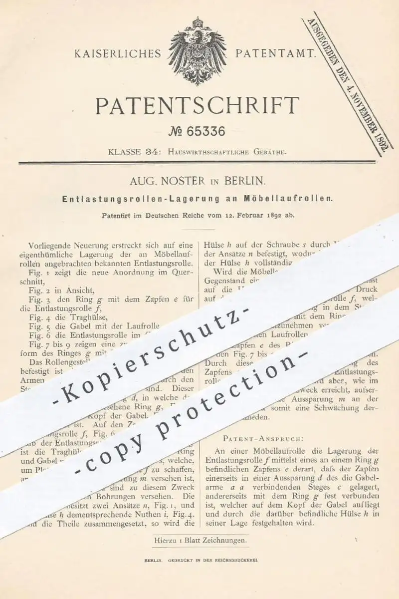 original Patent - Aug. Noster , Berlin , 1892 , Entlastungsrollen - Lagerung an Möbellaufrollen | Möbel , Möbelbauer !!!