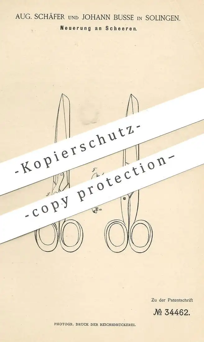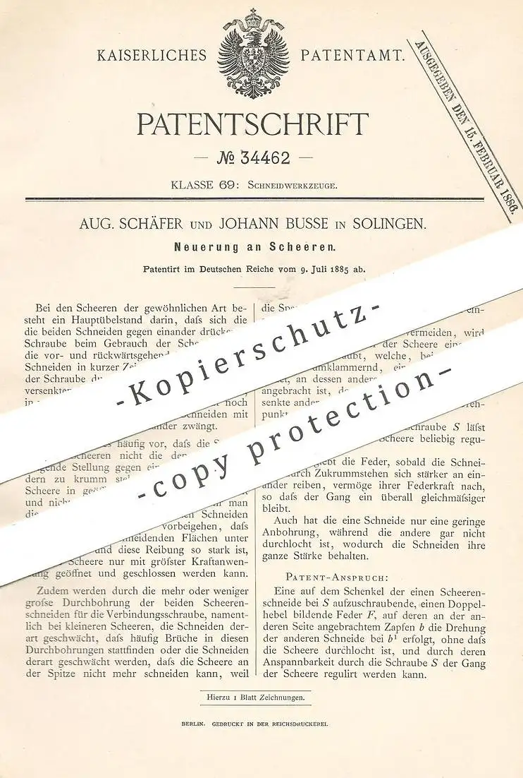 original Patent - Aug. Schäfer , Johann Busse , Solingen , 1885 , Schere , Scheren | Messer , Klinge , Schneidwerkzeug !