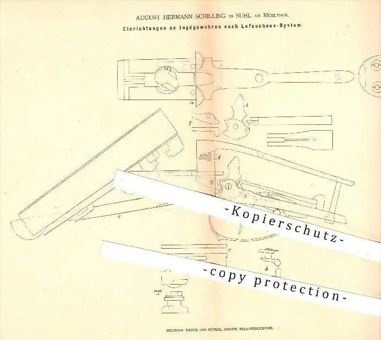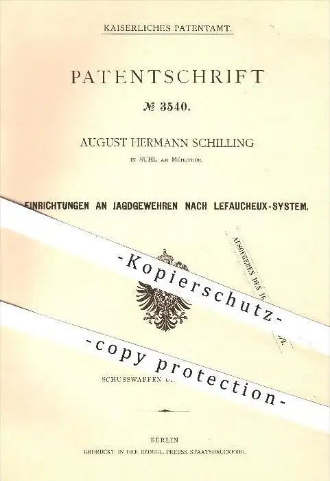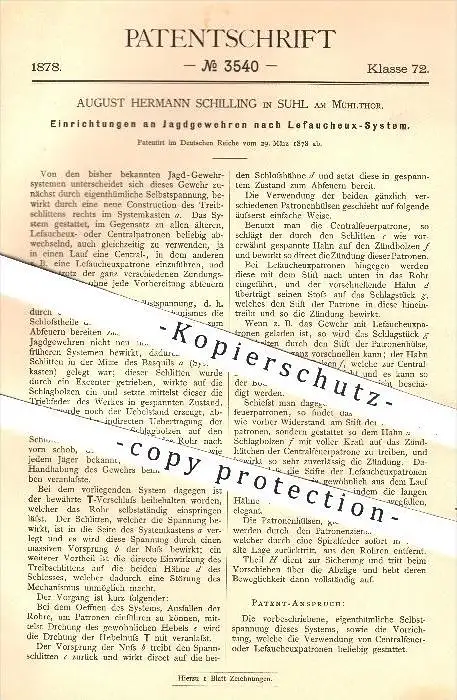 original Patent - August H. Schilling , Suhl , Mühlthor , 1878, Jagd - Gewehr nach Lefaucheux - System , Gewehre , Waffe