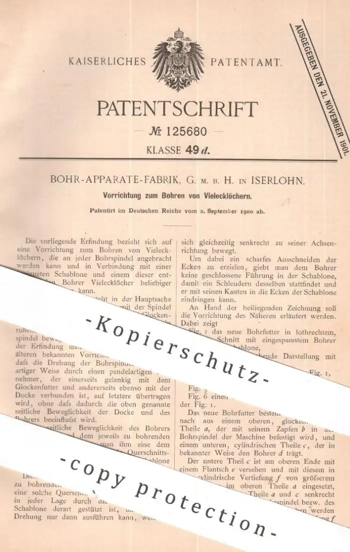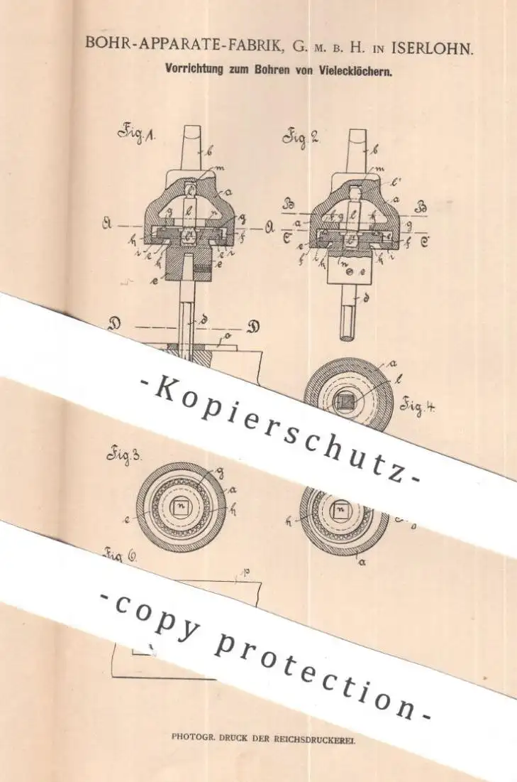 original Patent - Bohr - Apparate - Fabrik GmbH Iserlohn | 1900 | Vieleckloch Bohren | Bohrspindel | Bohrer Bohrmaschine