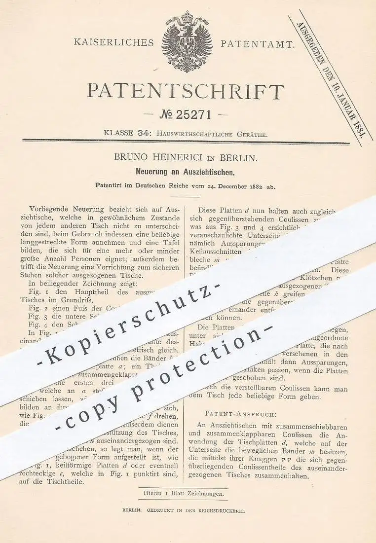 original Patent - Bruno Heinerici , Berlin , 1882 , Ausziehtisch | Tisch zum Ausziehen | Tischler , Holz , Möbel !!