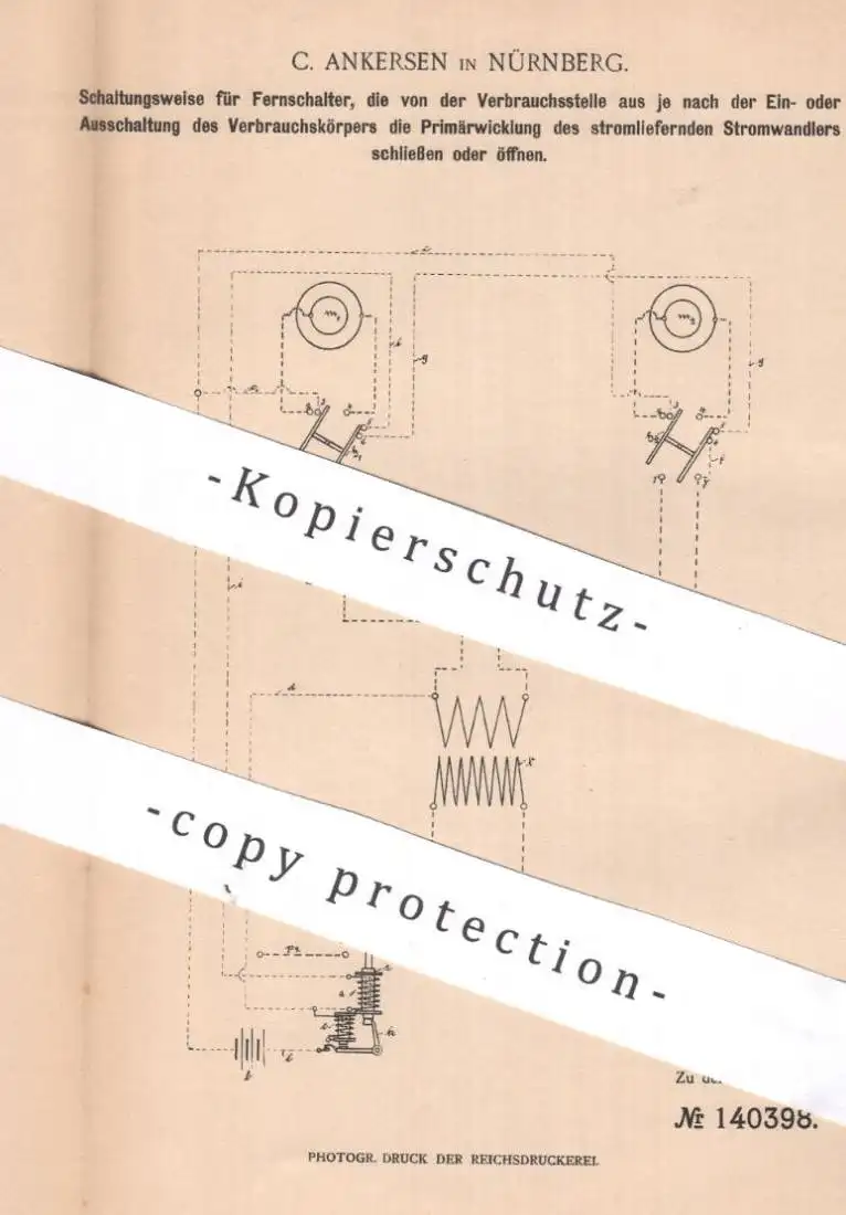original Patent - C. Ankersen , Nürnberg | 1902 | Schaltungsweise für Fernschalter | Strom , Stromwandler , Elektriker !