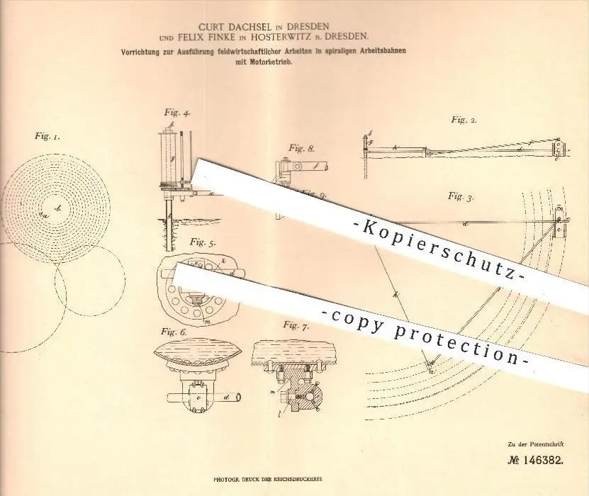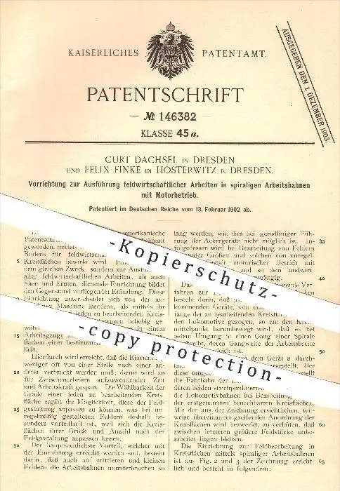 original Patent - C. Dachsel , Dresden u. F. Finke , Hosterwitz , 1902 , Feld-Arbeiten in Arbeitsbahnen mit Motorbetrieb