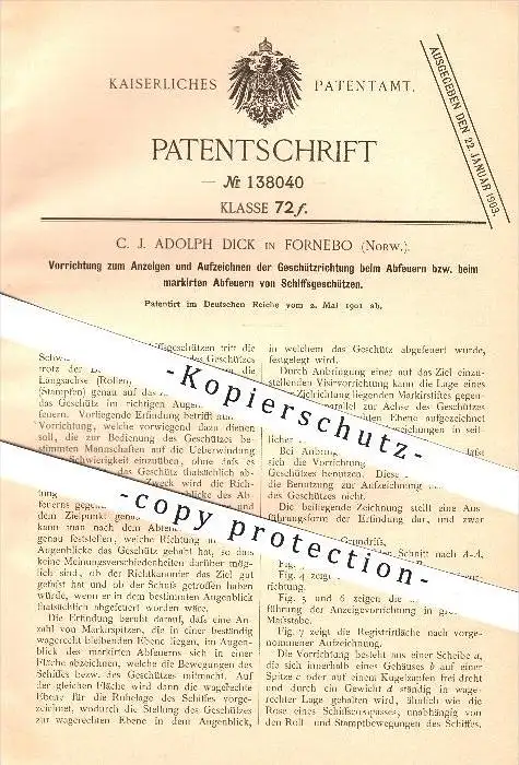 original Patent - C. J. Adoplh Dick in Fornebu , Norwegen , 1901 , Abfeuern von Schiffsgeschützen , Schiffe !!!