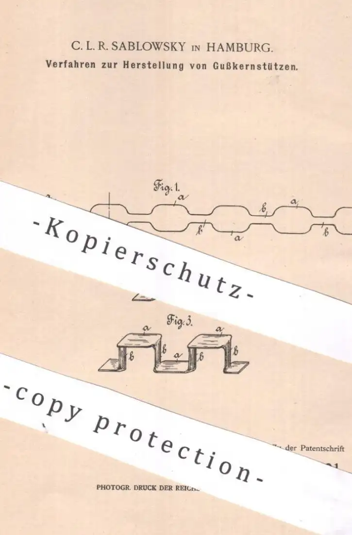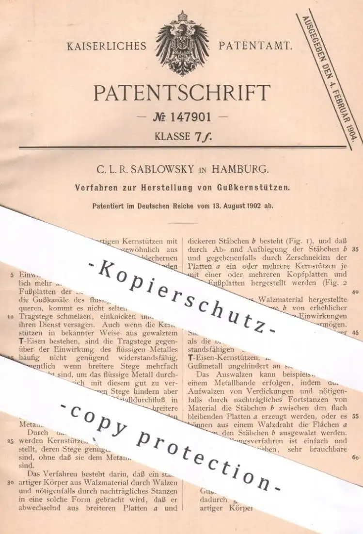original Patent - C. L. R. Sablowsky , Hamburg , 1902 , Herst. von Gußkernstützen | Gusseisen , Eisen , Metall , Stahl !