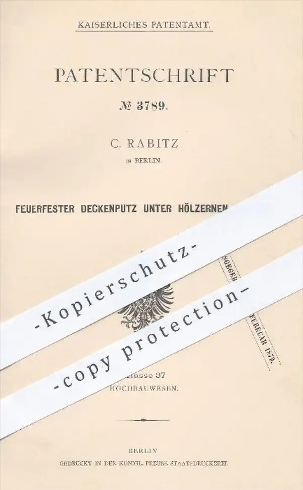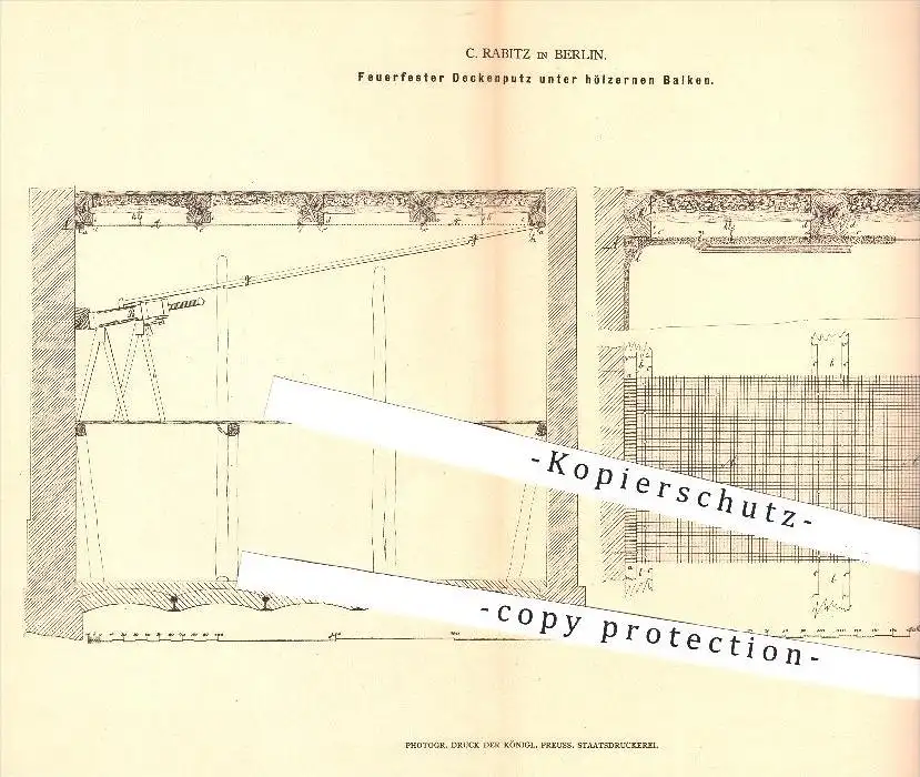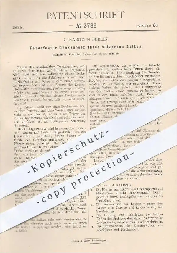 original Patent - C. Rabitz , Berlin , 1878 , Feuerfester Deckenputz unter hölzernen Balken | Hochbau , Putz , Schalung