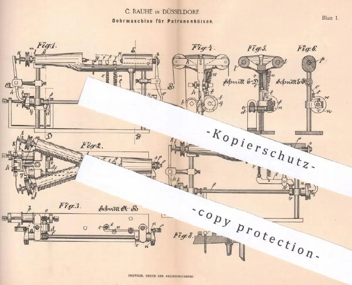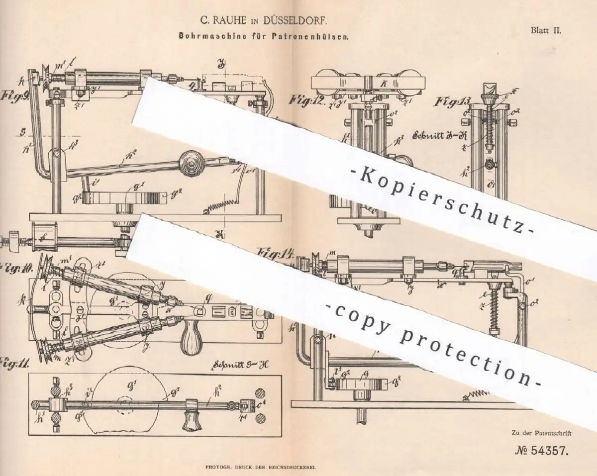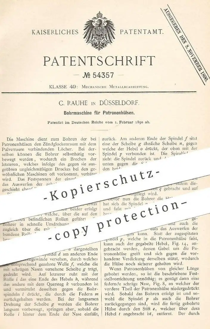 original Patent - C. Rauhe , Düsseldorf , 1890 , Bohrmaschine für Patronenhülsen | Patronen , Bohren | Metall , Waffen