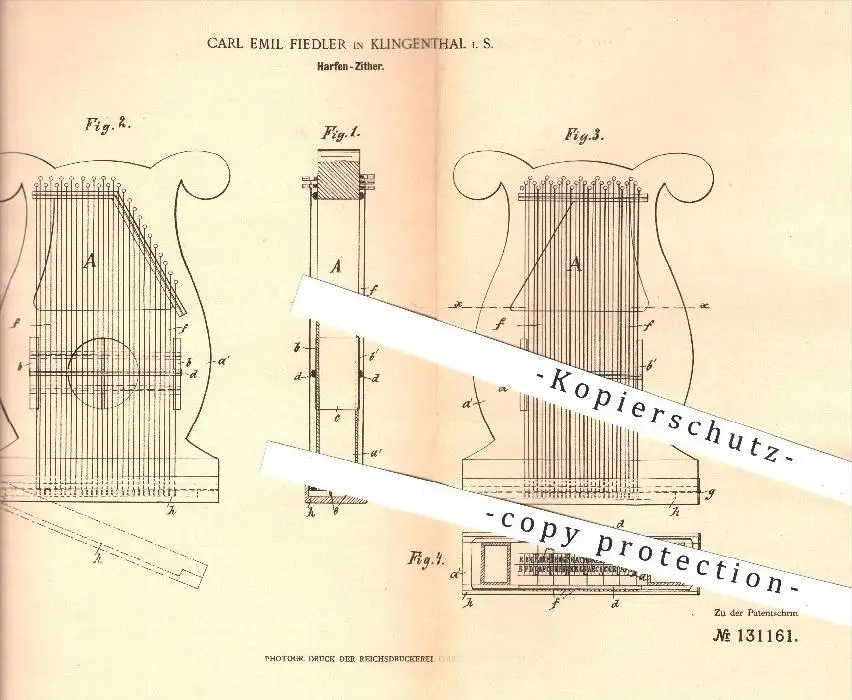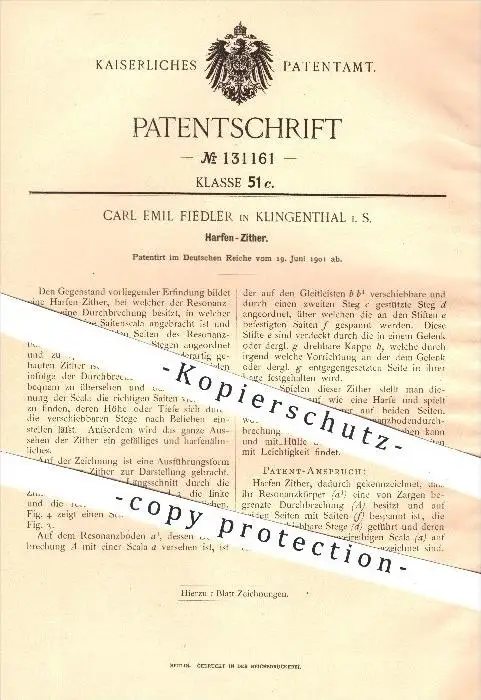 original Patent - Carl Emil Fiedler in Klingenthal , 1901 , Harfen - Zitter , Harfe , Zittern , Musikinstrument , Musik