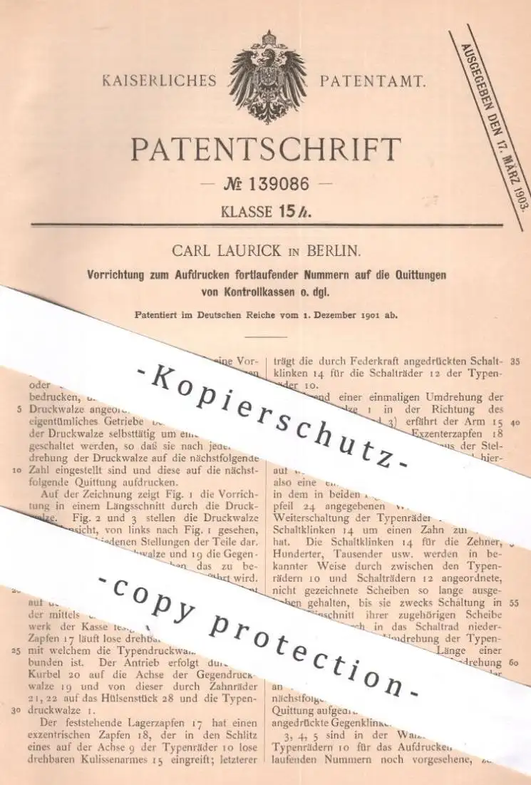 original Patent - Carl Laurick , Berlin | 1901 | Aufdrucken fortlaufender Nummern auf Quittungen von Kassen | Kasse Bon
