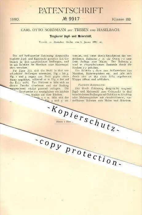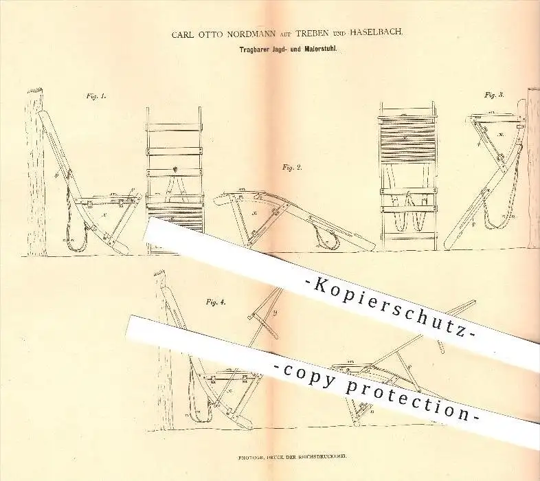 original Patent - Carl Otto Nordmann auf Treben und Haselbach , 1880 , Tragbarer Jagd - u. Malerstuhl , Stuhl , Jäger