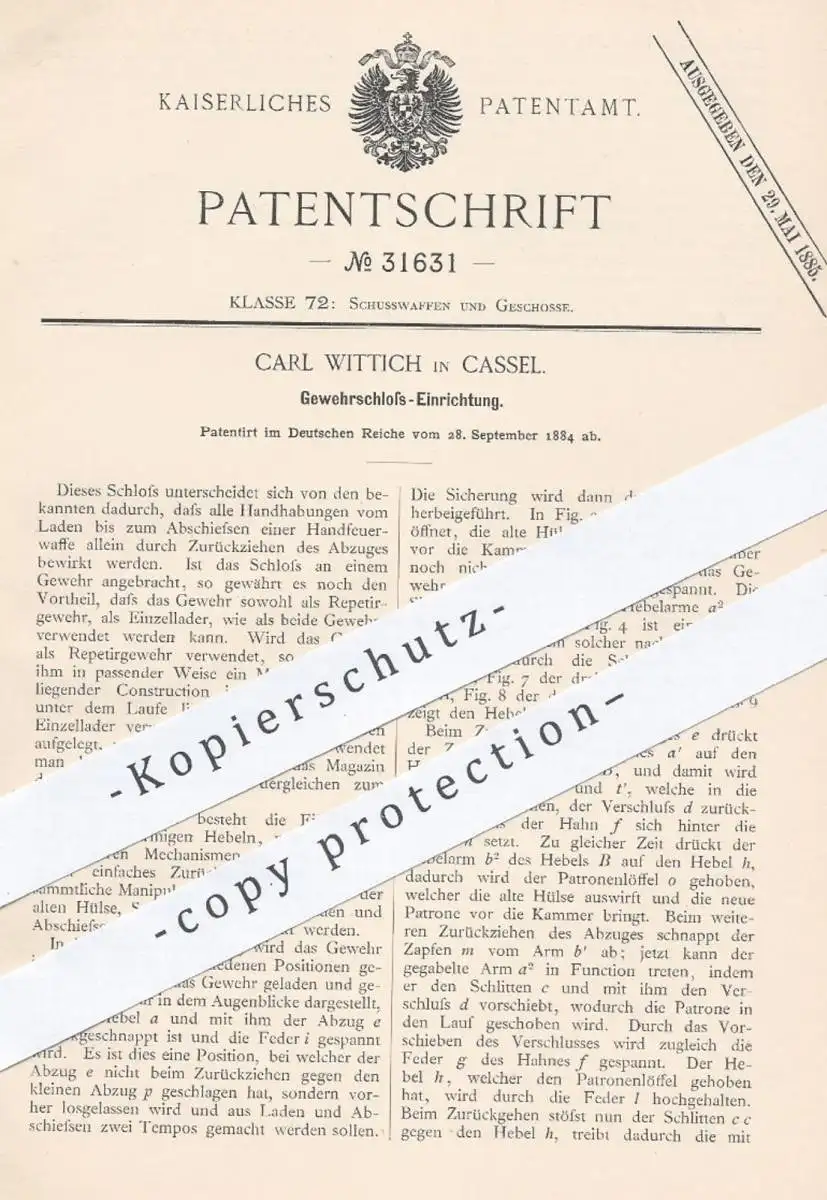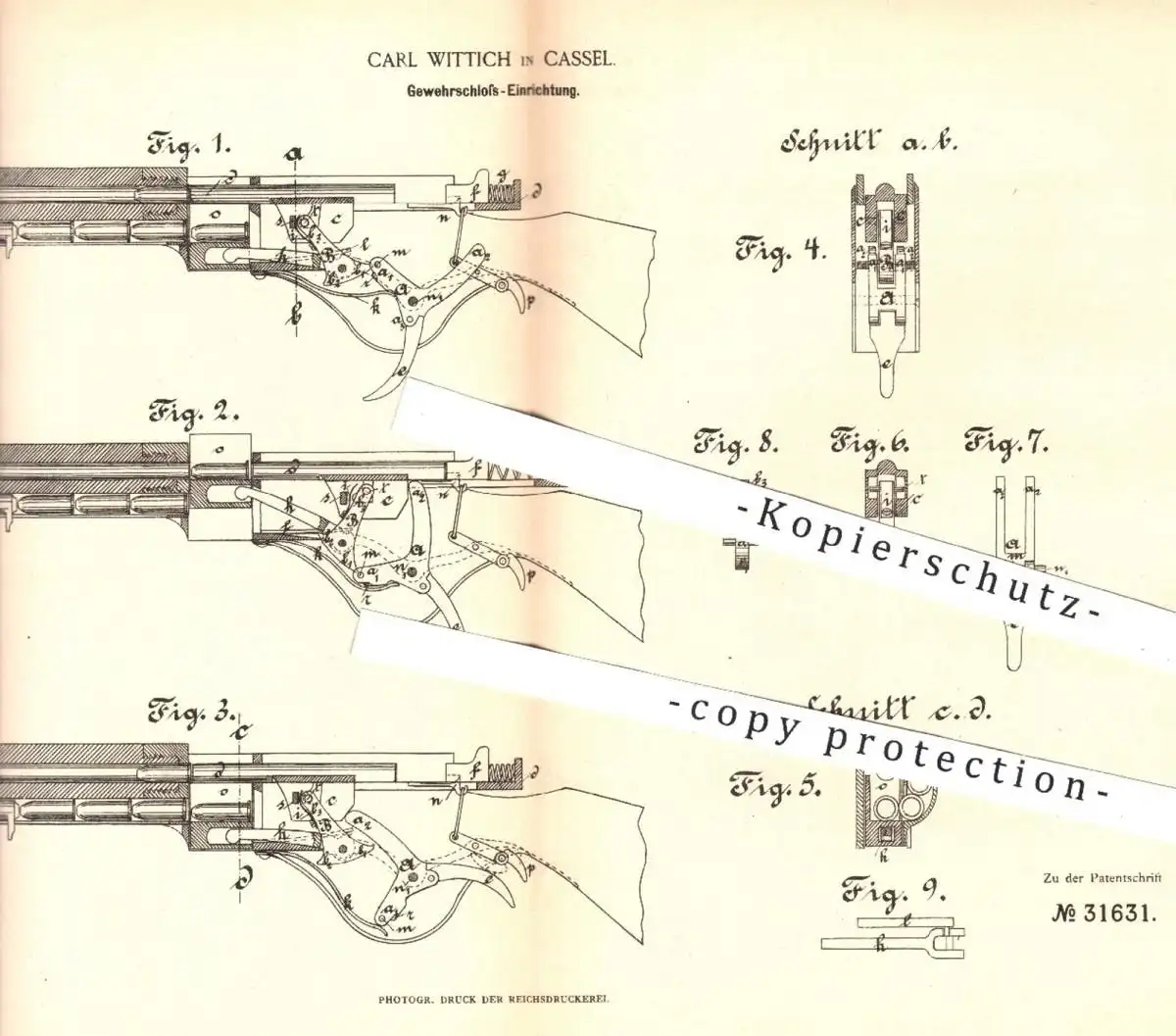 original Patent - Carl Wittich , Kassel , 1884 , Gewehrschloss - Einrichtung | Gewehre , Waffen , Militär , Jagd !!