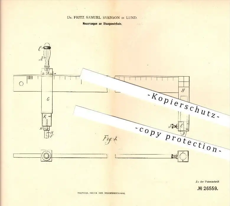 original Patent - Dr. Fritz Samuel Svenson in Lund , 1883 , Stangenzirkel , Zirkel , Messen , Bemessung !!!