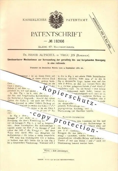 original Patent - Dr. Isidor Altschul in Tirgu Jin , Rumänien , 1881 , Mechanismus , Targu-Mures !!!
