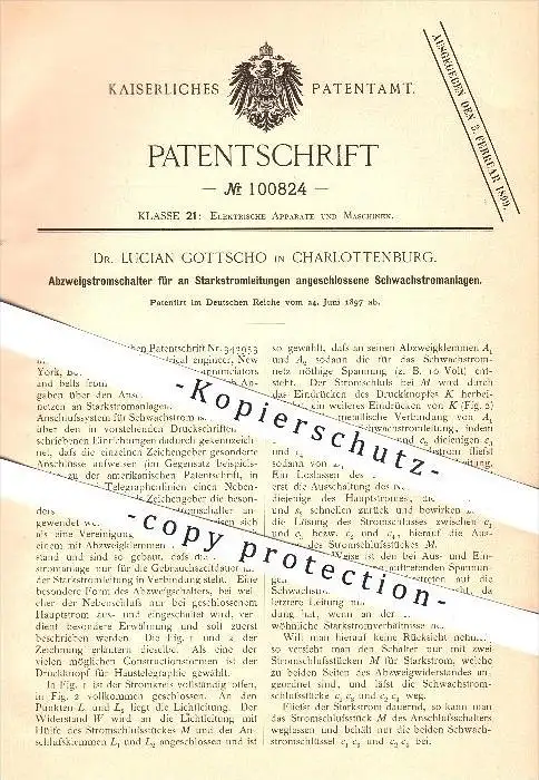 original Patent - Dr. Lucian Gottscho , Charlottenburg , 1897 , Abzweigstromschalter , Strom , Starkstrom , Elektrik !!