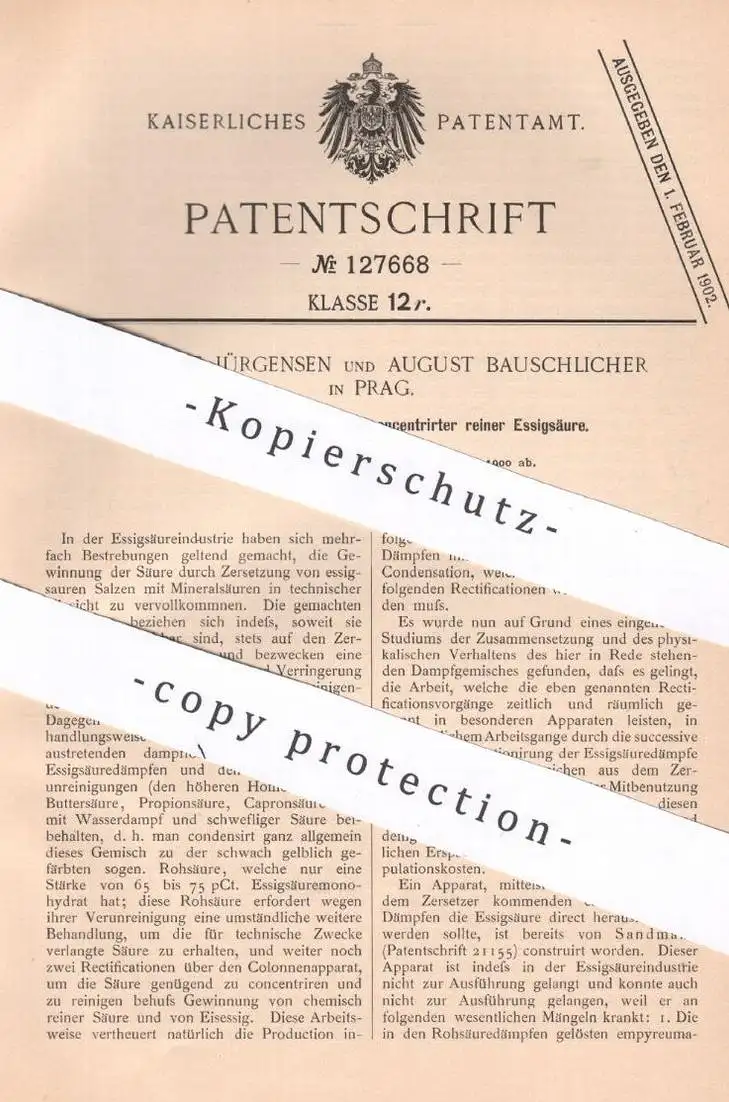 original Patent - Dr. Rolof Jürgensen , August Bauschlicher , Prag , 1900 , Gewinnung reiner konzentrierter Essigsäure