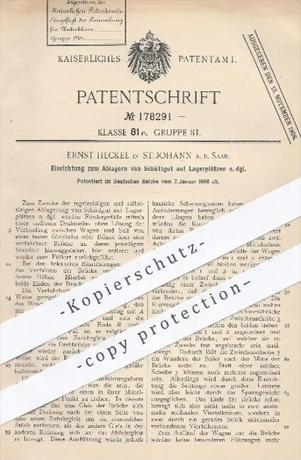original Patent - E. Heckel , St. Johann / Saar , 1906 , Ablagern von Schüttgut auf Lagerplätzen | Lagerhaltung , Lagern