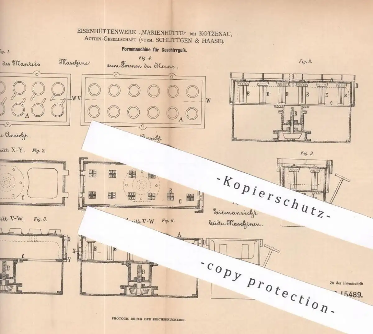 original Patent - Eisenhüttenwerk Marienhütte / Kotzenau AG vorm. Schlittgen & Haase | 1880 | Form für Geschirrguss