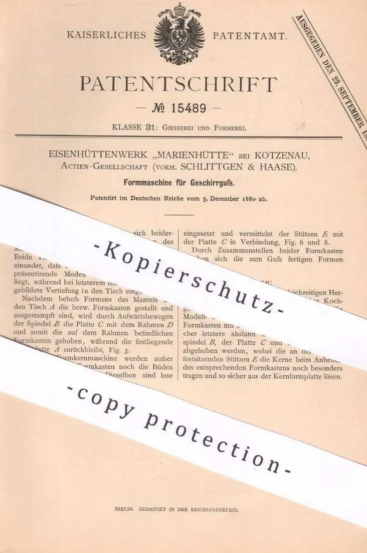 original Patent - Eisenhüttenwerk Marienhütte / Kotzenau AG vorm. Schlittgen & Haase | 1880 | Form für Geschirrguss