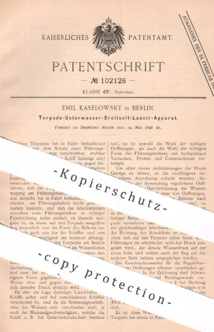 original Patent - Emil Kaselowsky , Berlin , 1898 , Torpedo - Unterwasser - Breitseit - Lancierapparat | Torpedos