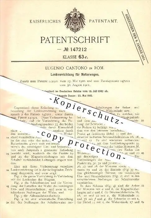 original Patent - Eugenio Cantono in Rom , 1902 , Sterzo dei veicoli a motore , Automobile !!!