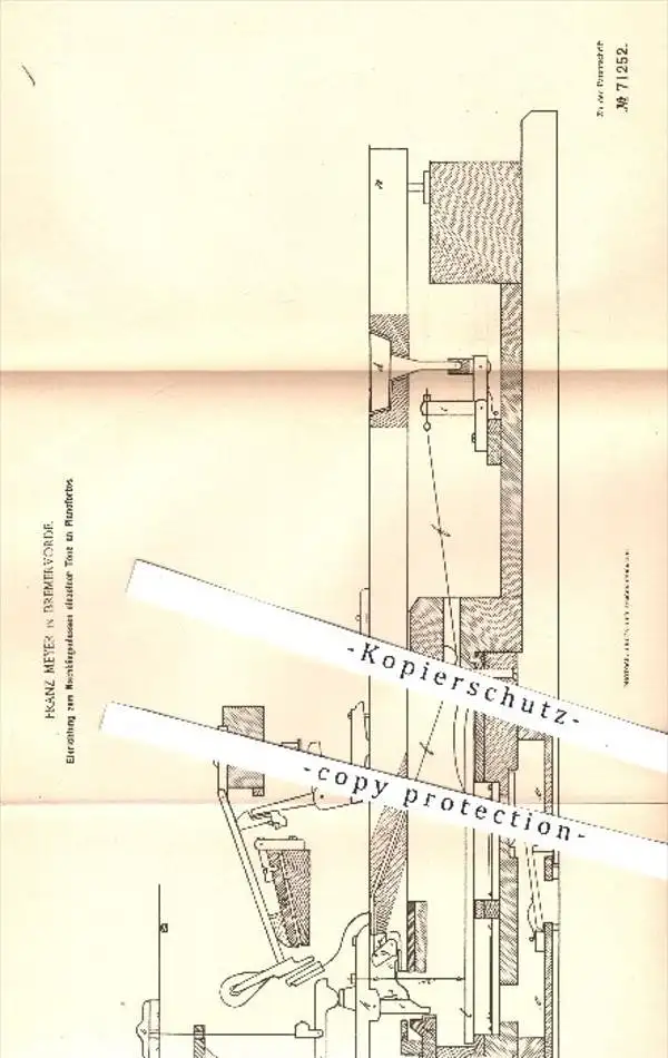 original Patent - F. Meyer , Bremervörde , 1891 , Nachklingenlassen der Töne an Pianofortes , Piano , Klavier , Musik