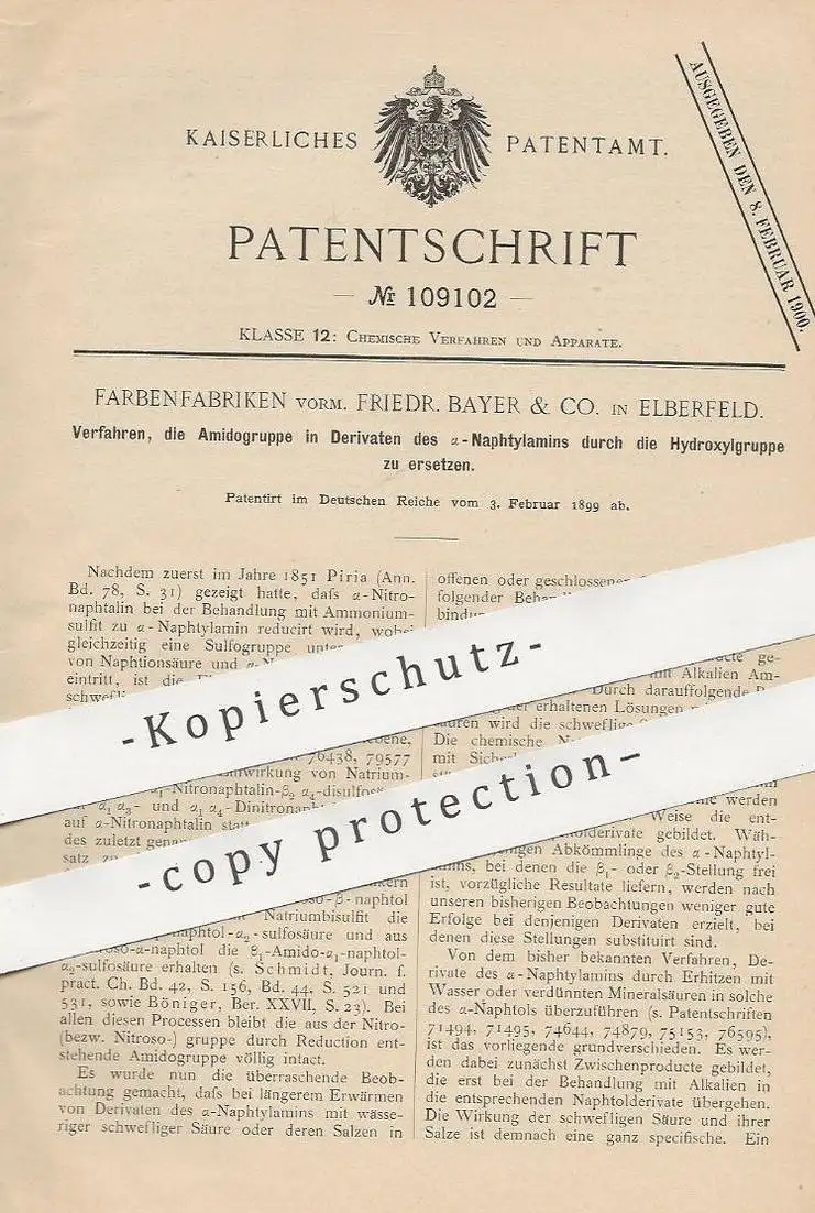 original Patent - Farbenfabriken vorm. Fr. Bayer & Co. Elberfeld | 1899 | Ersetzen der Amidogruppe in Derivaten | Chemie