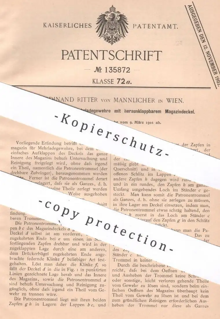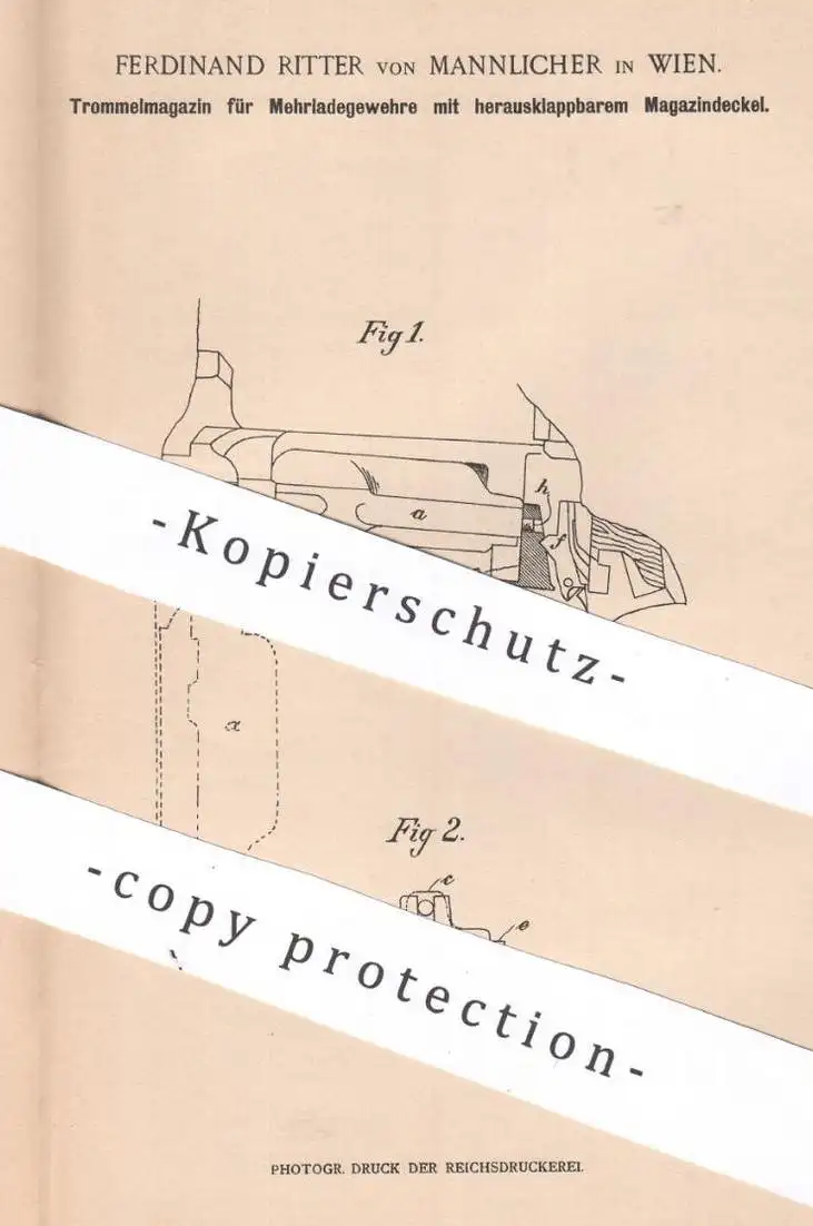 original Patent - Ferdinand Ritter von Mannlicher , Wien , Österreich 1901 , Trommelmagazin für Mehrladegewehr | Gewehr