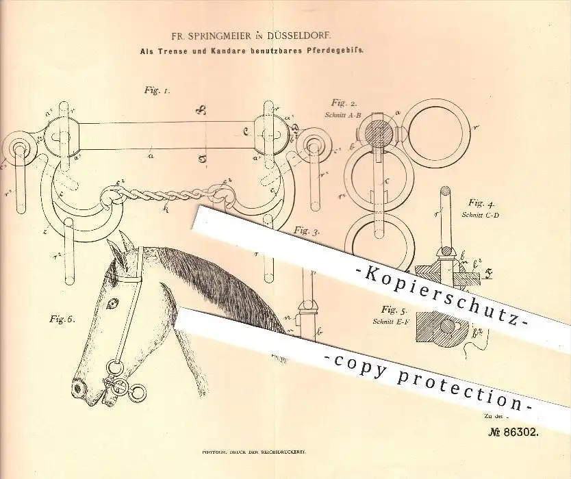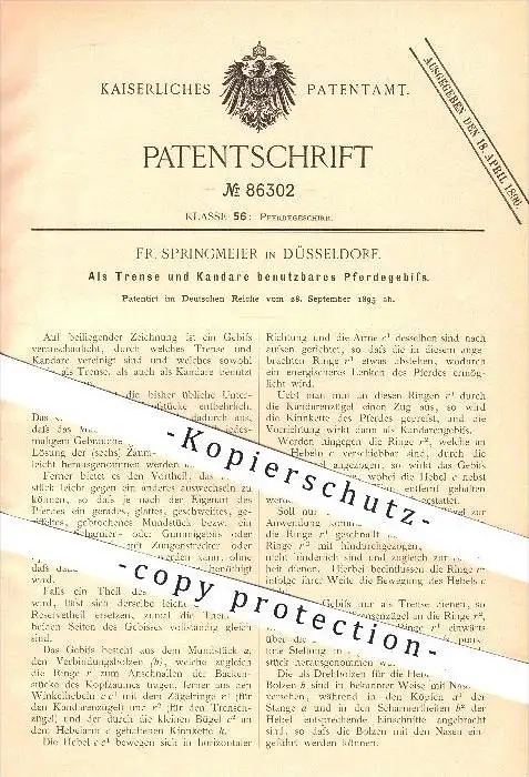 original Patent - Fr. Springmeier in Düsseldorf , 1895 , Als Trense u. Kandare benutzbares Pferdegebiss , Pfedegeschirr