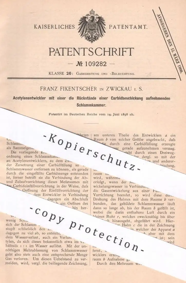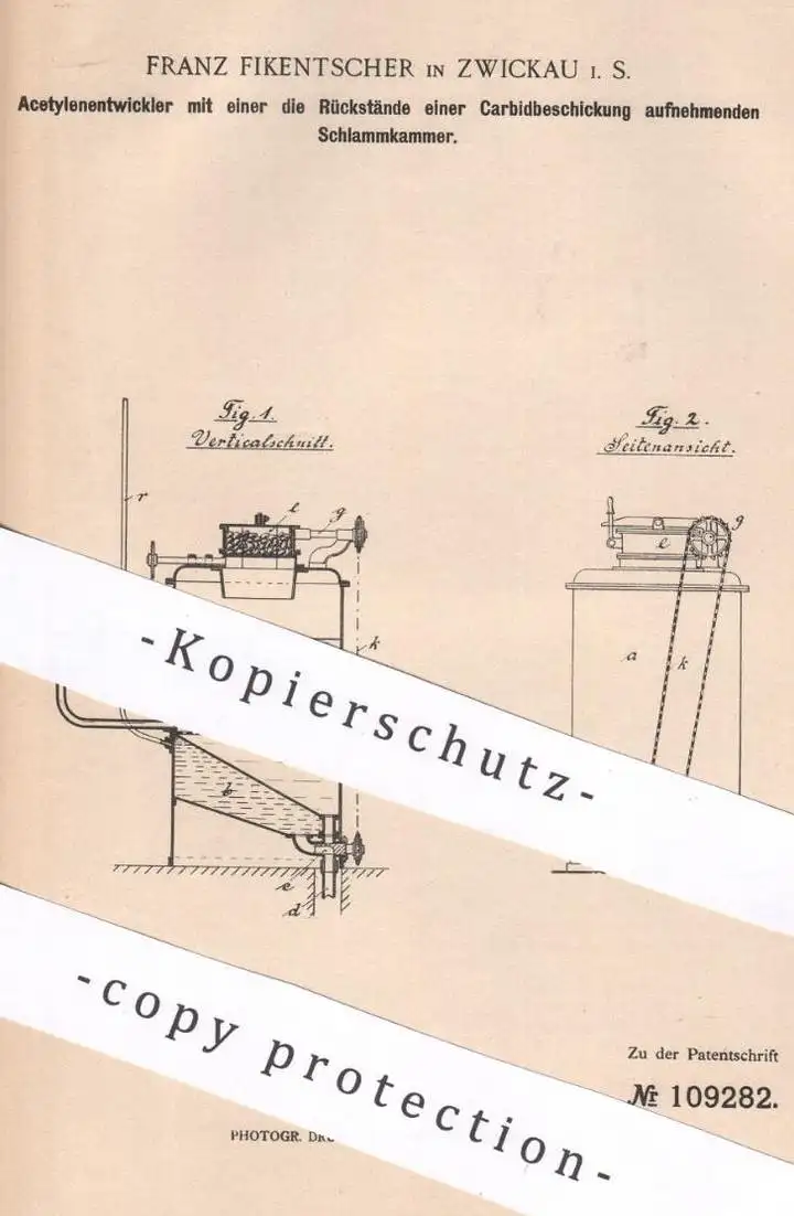 original Patent - Franz Fikentscher , Zwickau , 1898 , Acetylenentwickler mit Schlammkammer | Karbid , Carbid , Gas