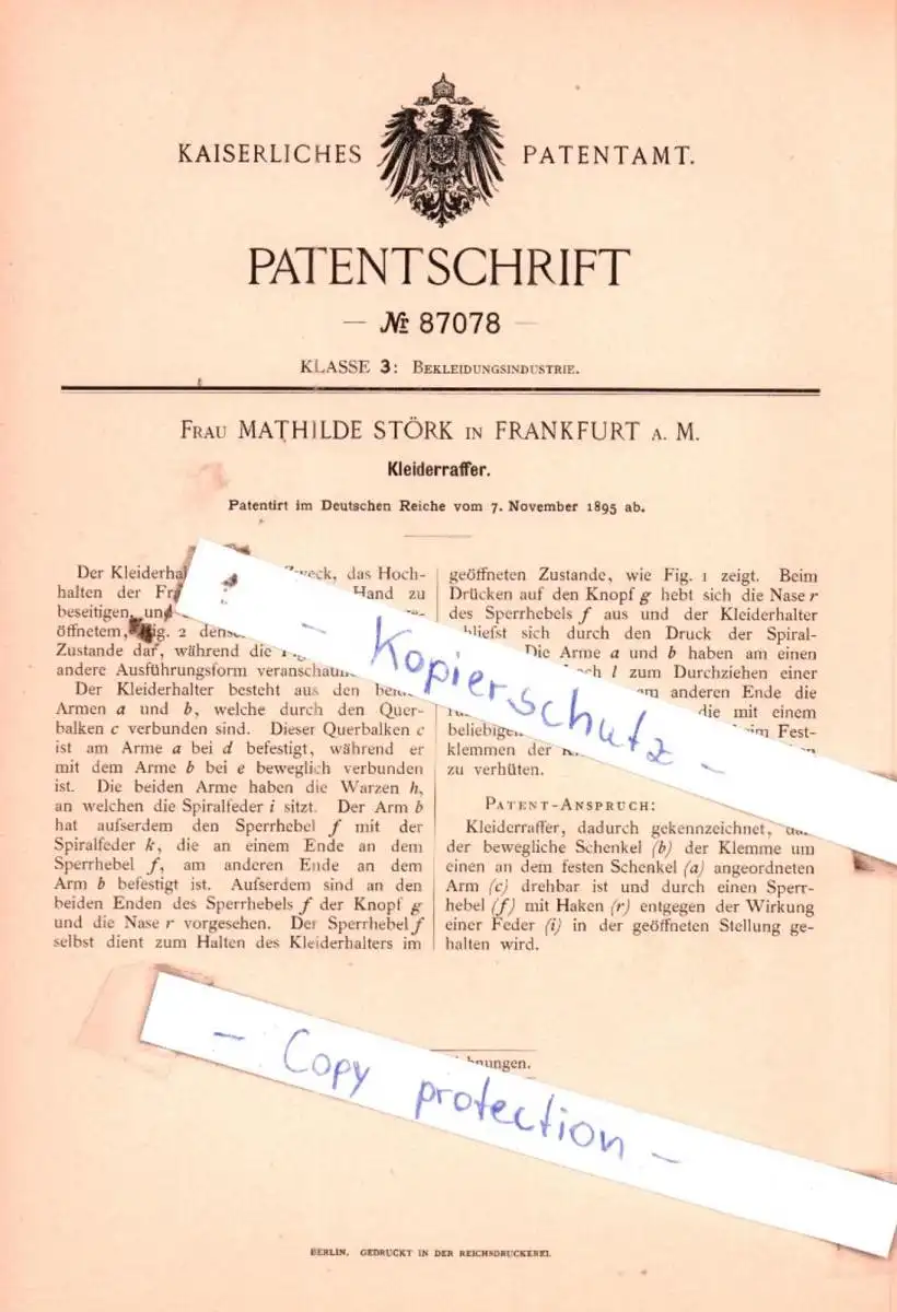 original Patent - Frau Mathilde Störk in Frankfurt a. M. , 1895 , Kleiderraffer !!!