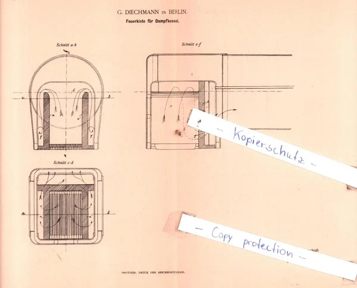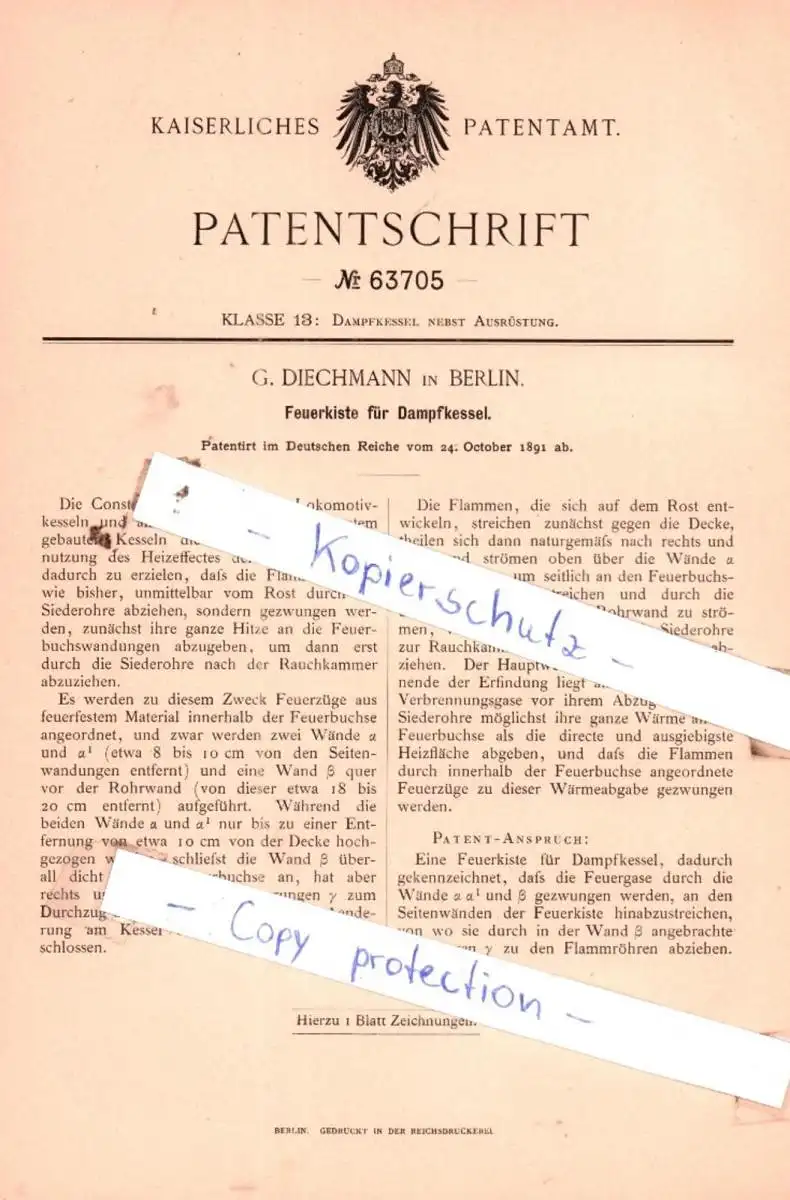 original Patent - G. Diechmann in Berlin , 1891 , Feuerkiste für Dampfkessel !!!
