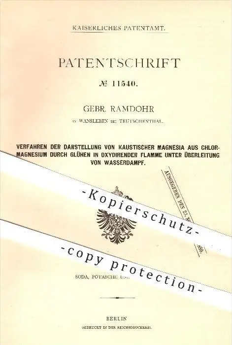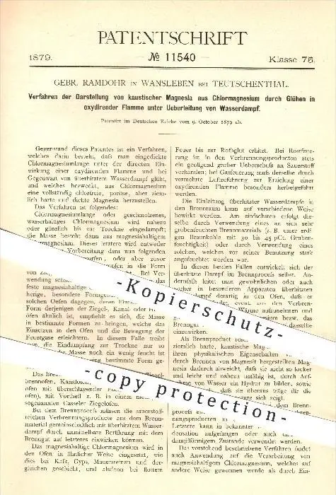 original Patent - Gebr. Ramdohr , Wansleben , Teutschenthal ,1879, Darstellung von kaustischer Magnesia , Chlormagnesium