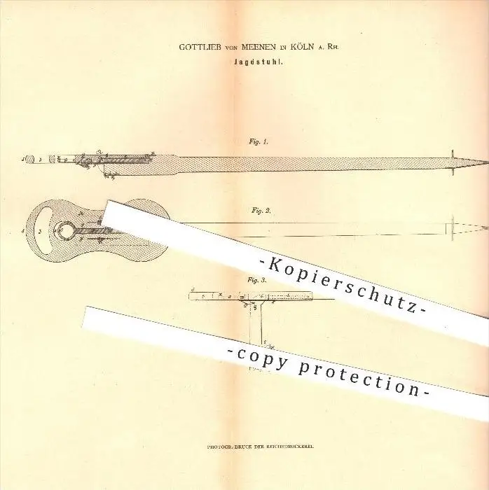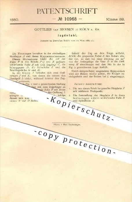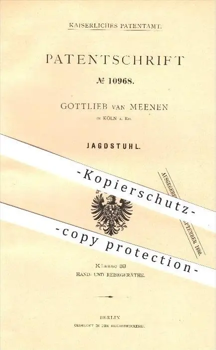 original Patent - Gottlieb van Meenen in Köln a. Rhein , 1880 , Jagdstuhl , Jagd , Stuhl , Jäger , Reisegepäck !!!