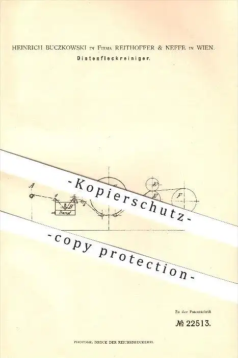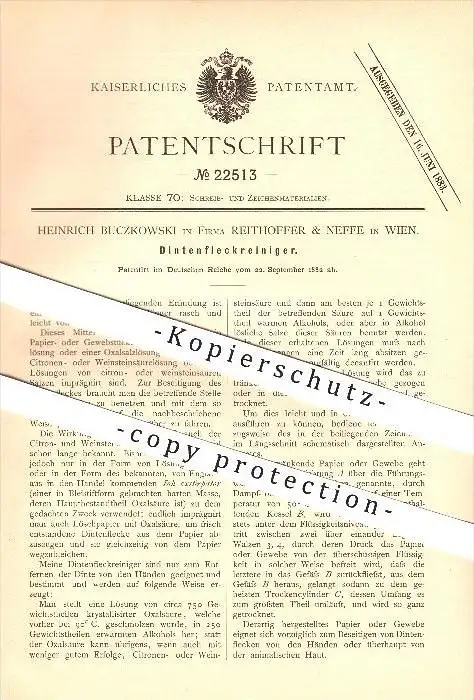 original Patent - H. Buczkowski , Reithoffer & Neffe in Wien , 1882 , Tintenfleckreiniger , Schreibmaterialien !!!