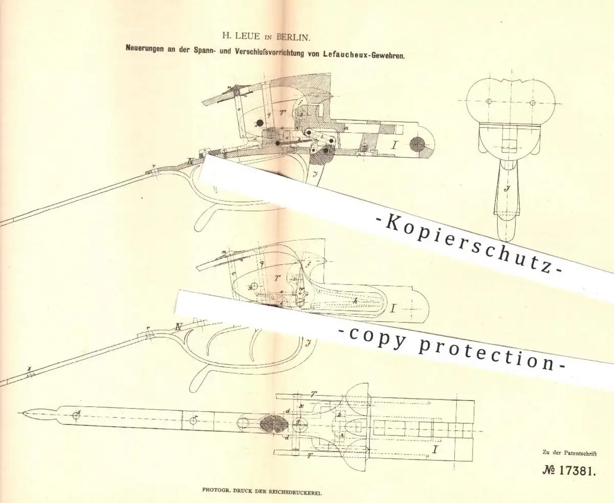 original Patent - H. Leue , Berlin , 1881 , Verschluss am Lefaucheux - Gewehr | Gewehre , Waffen , Jagd , Militär !!!