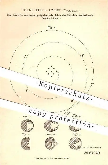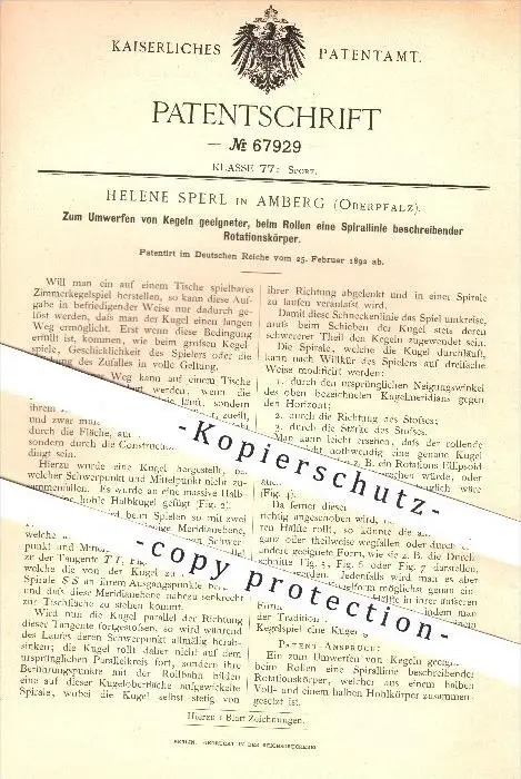 original Patent - Helene Sperl in Amberg , 1892 , Rotationskörper zum Kegeln , Kegel , Sport , Rotation , Spiel , Spiele
