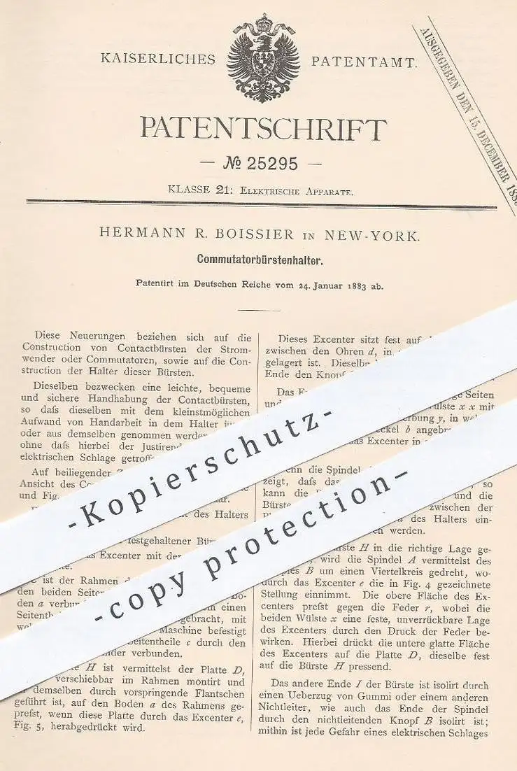 original Patent - Hermann R. Boissier , New York , 1883 , Kommutator - Bürstenhalter | Strom , Elektriker , Elektrik !!!