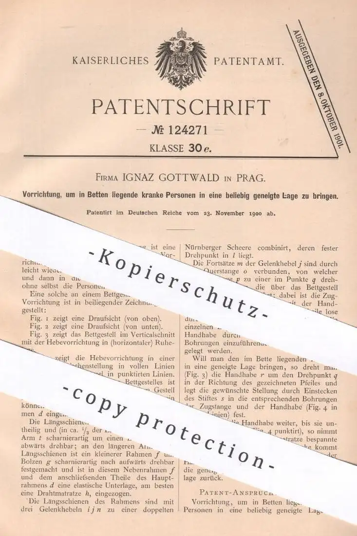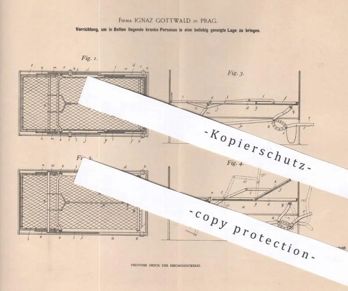 original Patent - Ignaz Gottwald , Prag , 1900 , verstellbares Krankenbett | Bett | Krankenhaus | Bettgestell | Klinik