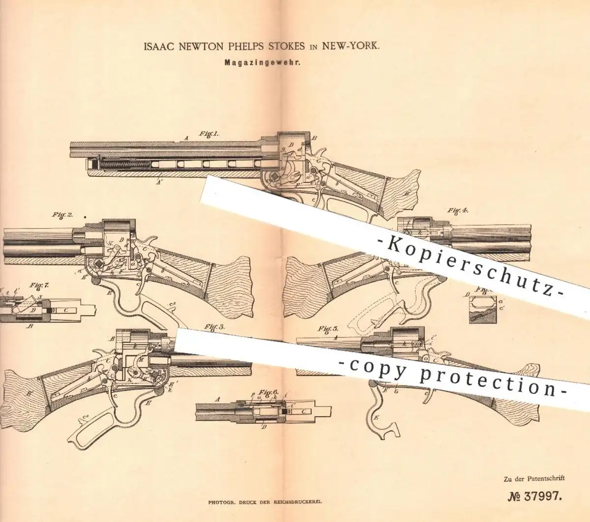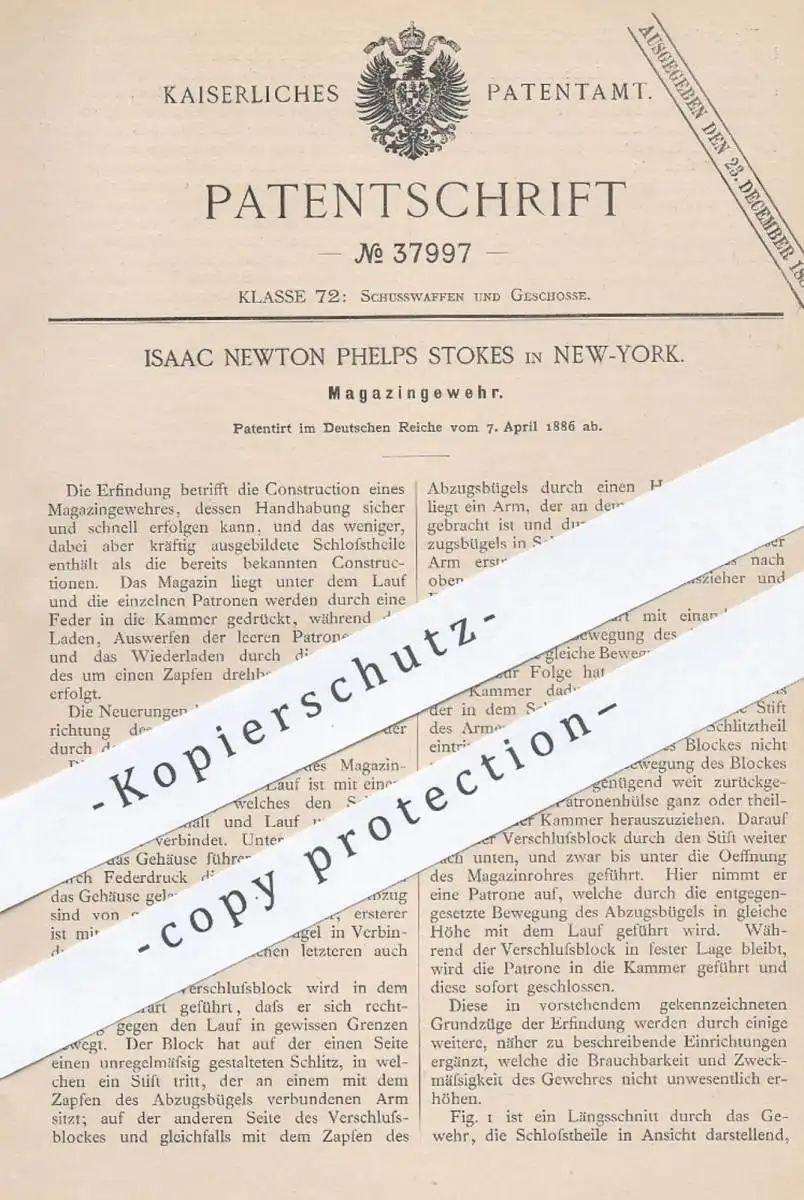 original Patent - Isaac Newton Phelps Stokes , New York USA , 1886 , Magazingewehr | Gewehre , Waffen , Militär , Jagd