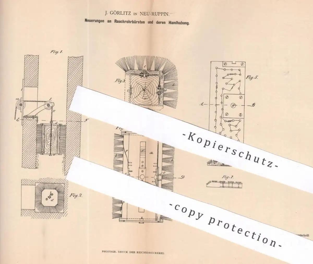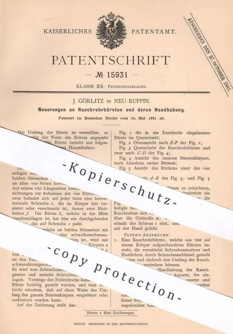 original Patent - J. Görlitz , Neuruppin , 1881 , Rauchrohrbürste | Rauchrohr - Bürste | Ofen , Öfen , Schornsteinfeger