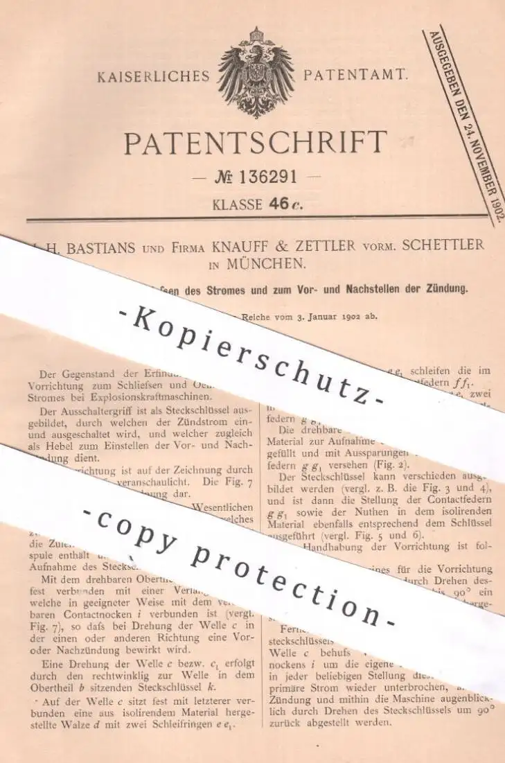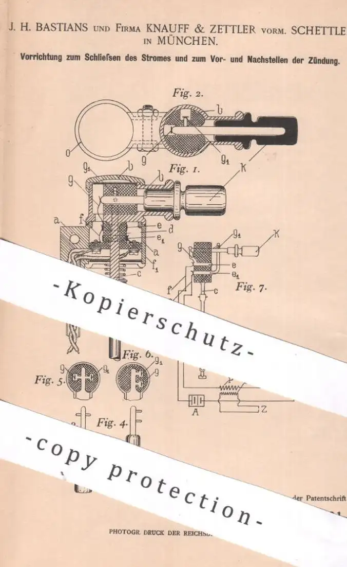 original Patent - J. H. Bastians u. Fa. Knauff & Zettler , vorm. Schettler , München | 1902 | Zündung an Motoren | Motor