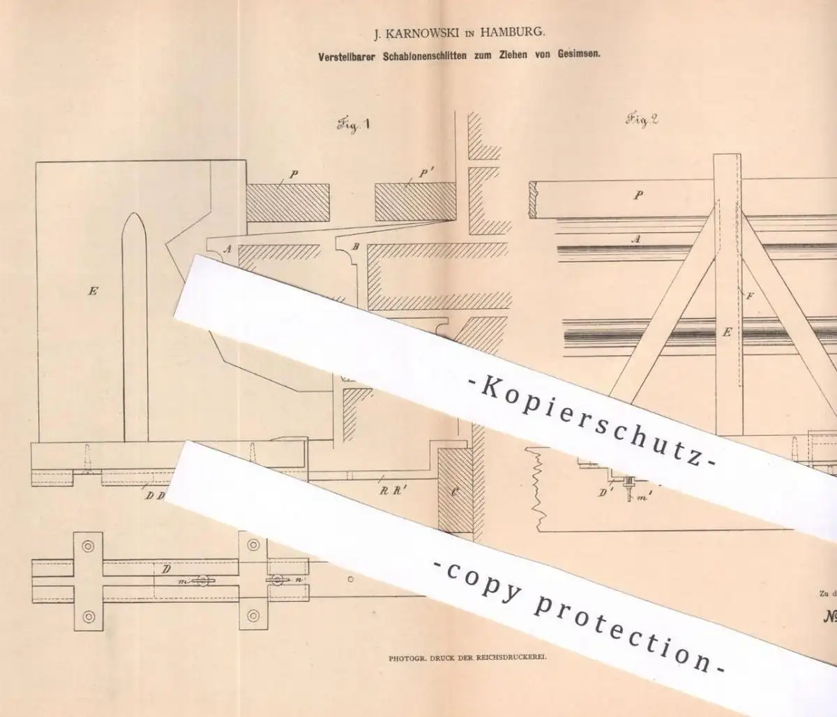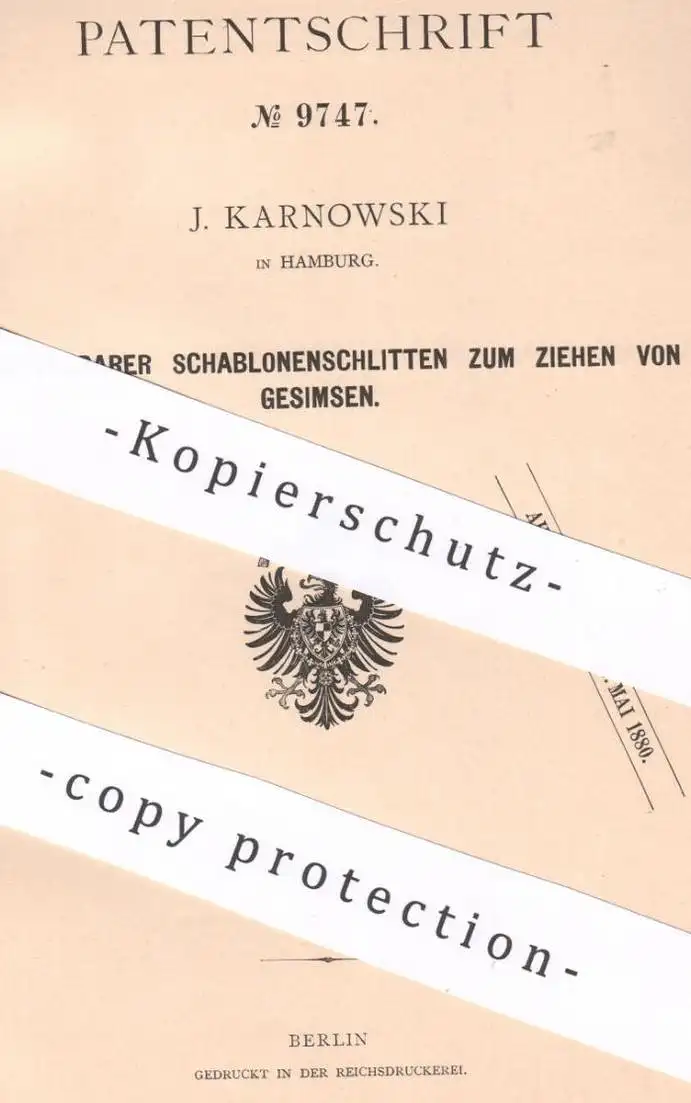original Patent - J. Karnowski , Hamburg , 1879 , Schablonenschlitten für Haus - Sims , Fassade | Bau , Hochbau !!