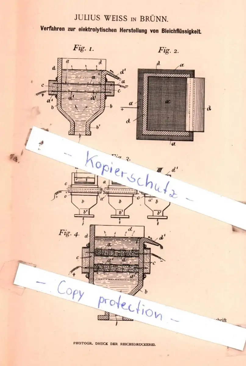 original Patent - J. Weiss in Brünn , 1895 , Verfahren zur elektrolytischen Herstellung von Bleichflüssigkeit !!!