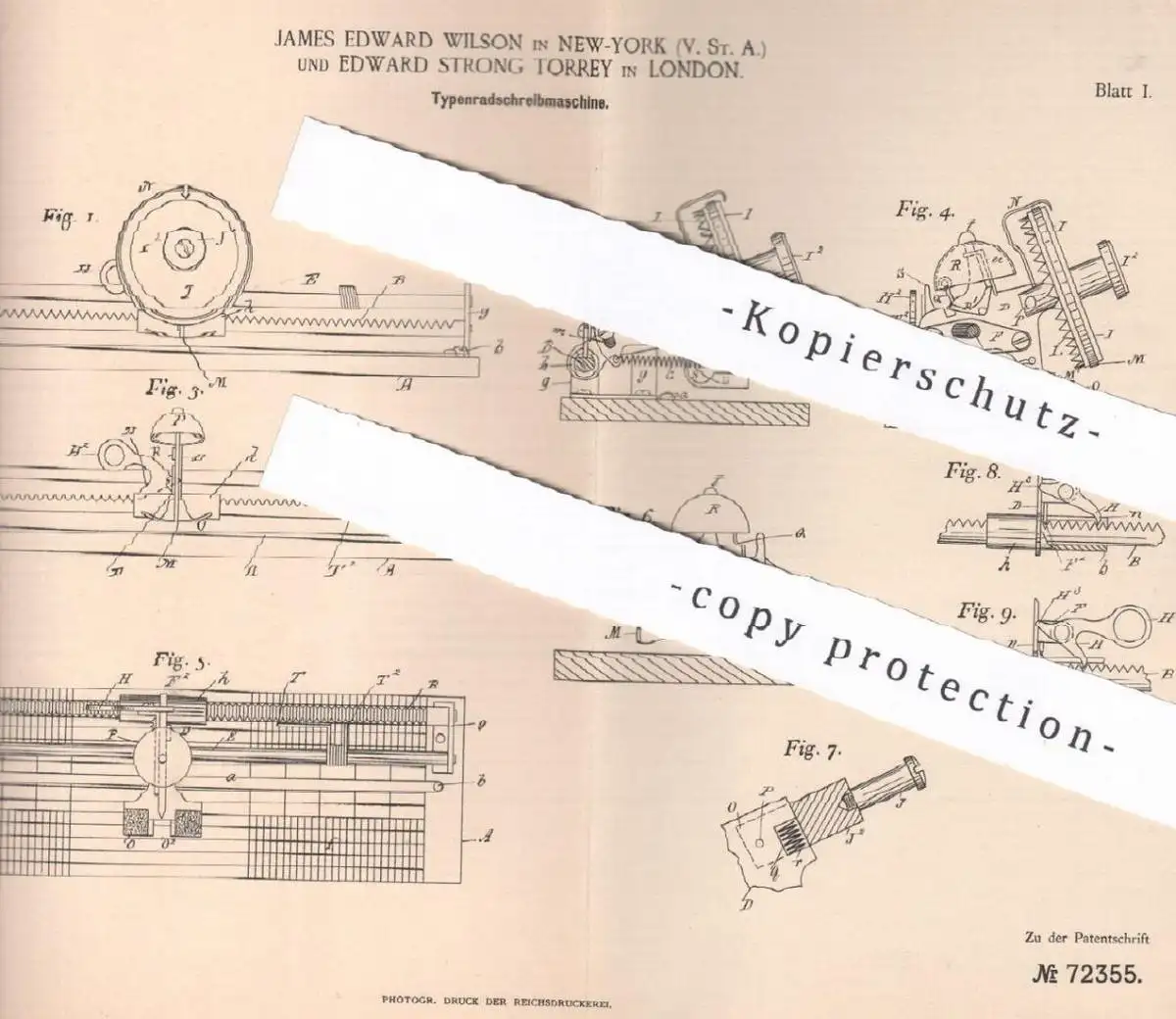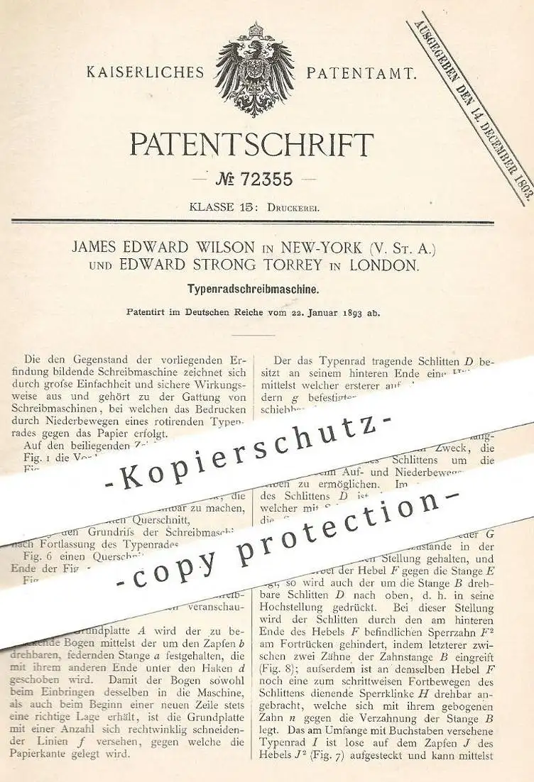 original Patent - James Edward Wilson , New York , USA | Edward Strong Torrey , London , 1893 , Typenradschreibmaschine
