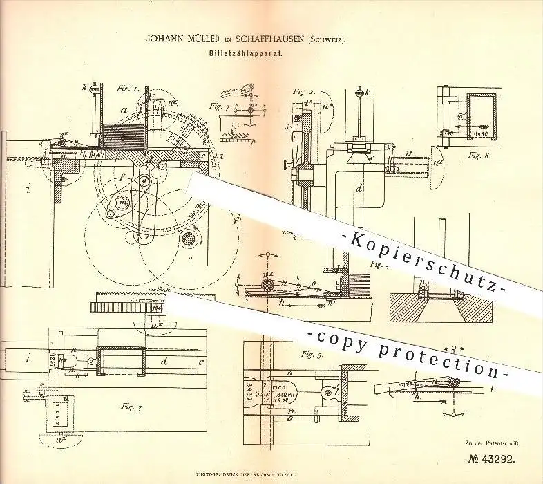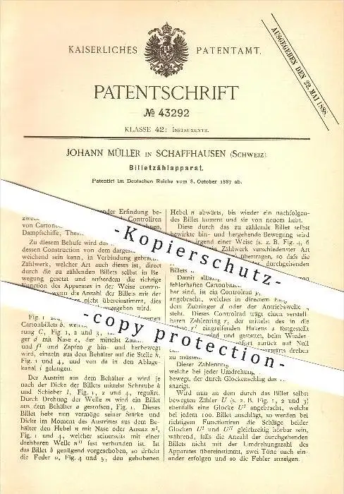 original Patent - Johann Müller in Schaffhausen , 1887 , Billetzählerapparat , Billets , Eisenbahn, Dampfschiff !!!