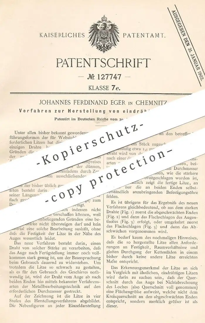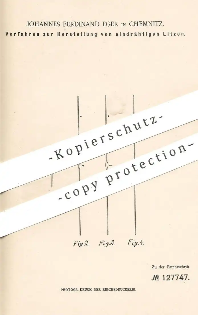original Patent - Johannes Ferdinand Eger , Chemnitz , 1900 , Herstellung von eindrähtiger Litze | Draht , Kabel !!!