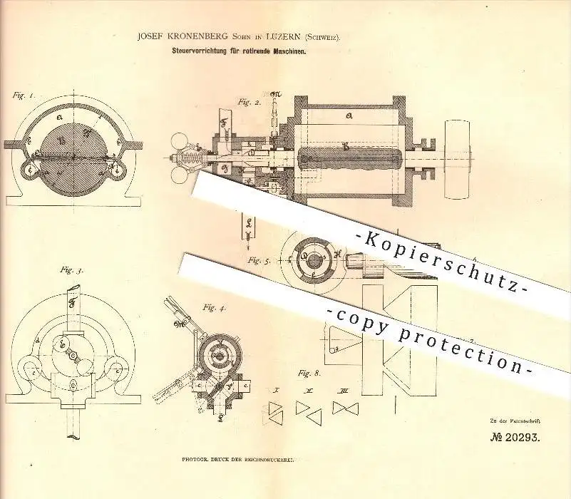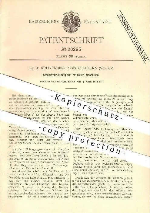 original Patent - Josef Kronenberg Sohn in Luzern , 1882 , Steuervorrichtung für rotierende Maschinen !!!