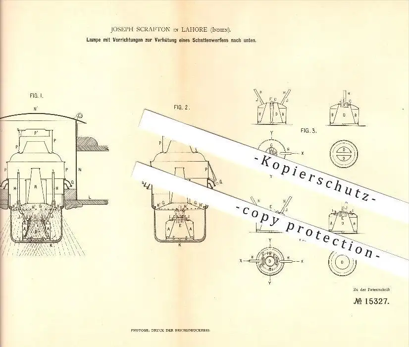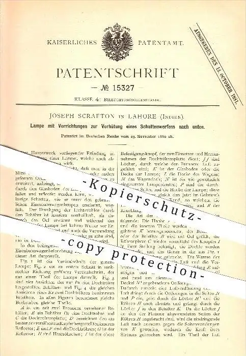 original Patent - Joseph Scrafton in Lahore , Indien , 1880 , Lampe mit Vorrichtung zur Verhütung eines Schattenwerfens