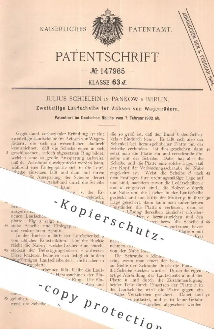 original Patent - Julius Schielein , Berlin / Pankow | 1902 | Laufscheibe für Achsen an Wagenräder | Rad Räder Eisenbahn